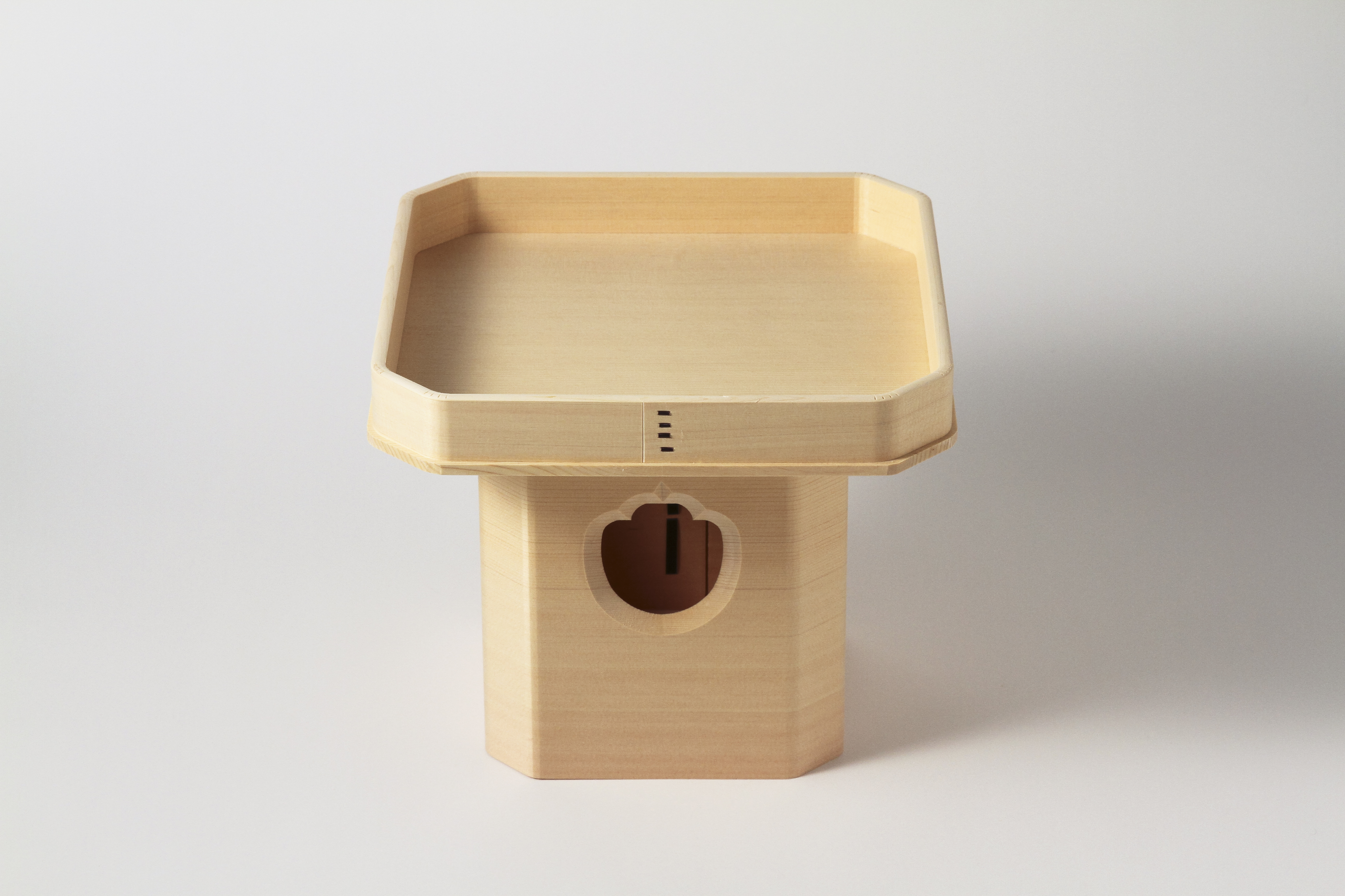 神ノ木である木曽檜で作りました。本職用です。 狂いの少ない本柾(糸柾)の板を使用しています。 総高さ 31.1p 折敷外径 35.6p×35.6p 折敷内径 33.9p×33.9p *職人による手作業の為、若干の誤差がある場合がございます